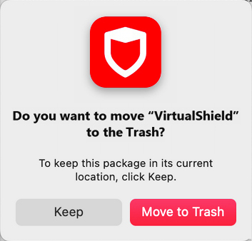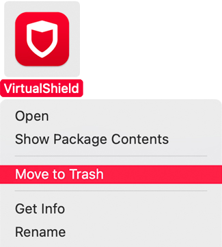 VirtualShield VPN app in this list, then Control-click the icon and select Move to Trash from the popup menu.