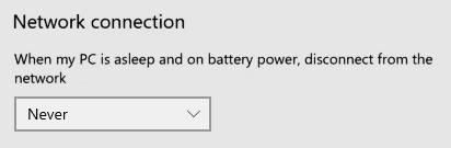 Below Network connection, find the option labeled “When my PC is asleep and on battery power, disconnect from the network”, and choose