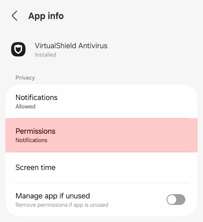 VirtualShield Antivirus app, then choose Permissions.